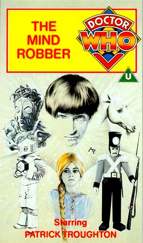 The_Mind_RobberStories of Doctor Who from the 1960’s were produced in black and white and the video covers refected this. However, there was the possibility to include some colour and in this case the colour was included in the realisation of Rapunzel. The golden hair brings life to the artwork but that does not mean that the rest of it is lacking in any way other than colour. The Mind Robber is a story with a lot of different elements and the majority of those are reflected in this cover. The white robots and Medusa are incredibly detailed and the addition of the clockwork robots and unicorn add more strong visual elements. Also of note is image of Patrick Troughton, with his hair taking a lot of the plaudits which always reflected his ‘cosmic hobo’ characterisation of the role.